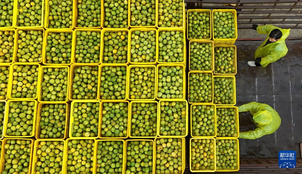 10月27日,在广西桂林市龙胜各族自治县龙脊镇中六村,果农在将罗汉果装车外运(无人机照片)。新华社发(潘志祥摄)