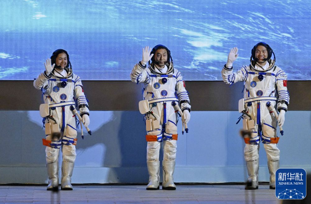 ↑10月30日,神舟十九号载人飞行任务航天员乘组出征仪式在酒泉卫星发射中心问天阁圆梦园广场举行。这是航天员蔡旭哲(中)、 宋令东(右)、王浩泽在出征仪式上。新华社记者 李鑫 摄
