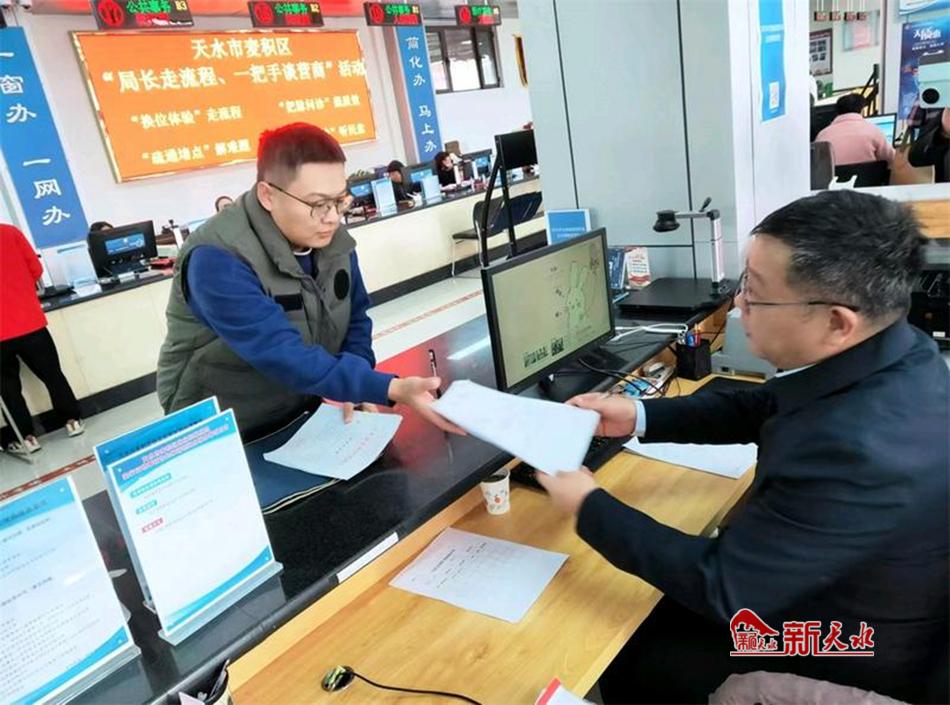 新天水讯【特约通讯员 窦耀辉】11月1日,麦积区林业和草原局在麦积区政务服务中心政务大厅林草局开办窗口开展了“局长走流程、一把手谈营商”活动,以“现场接待、现场办公”的形式,“零距离”为企业、群众提供全流程面对面服务,切实增强了办事企业和群众的获得感、满意度。