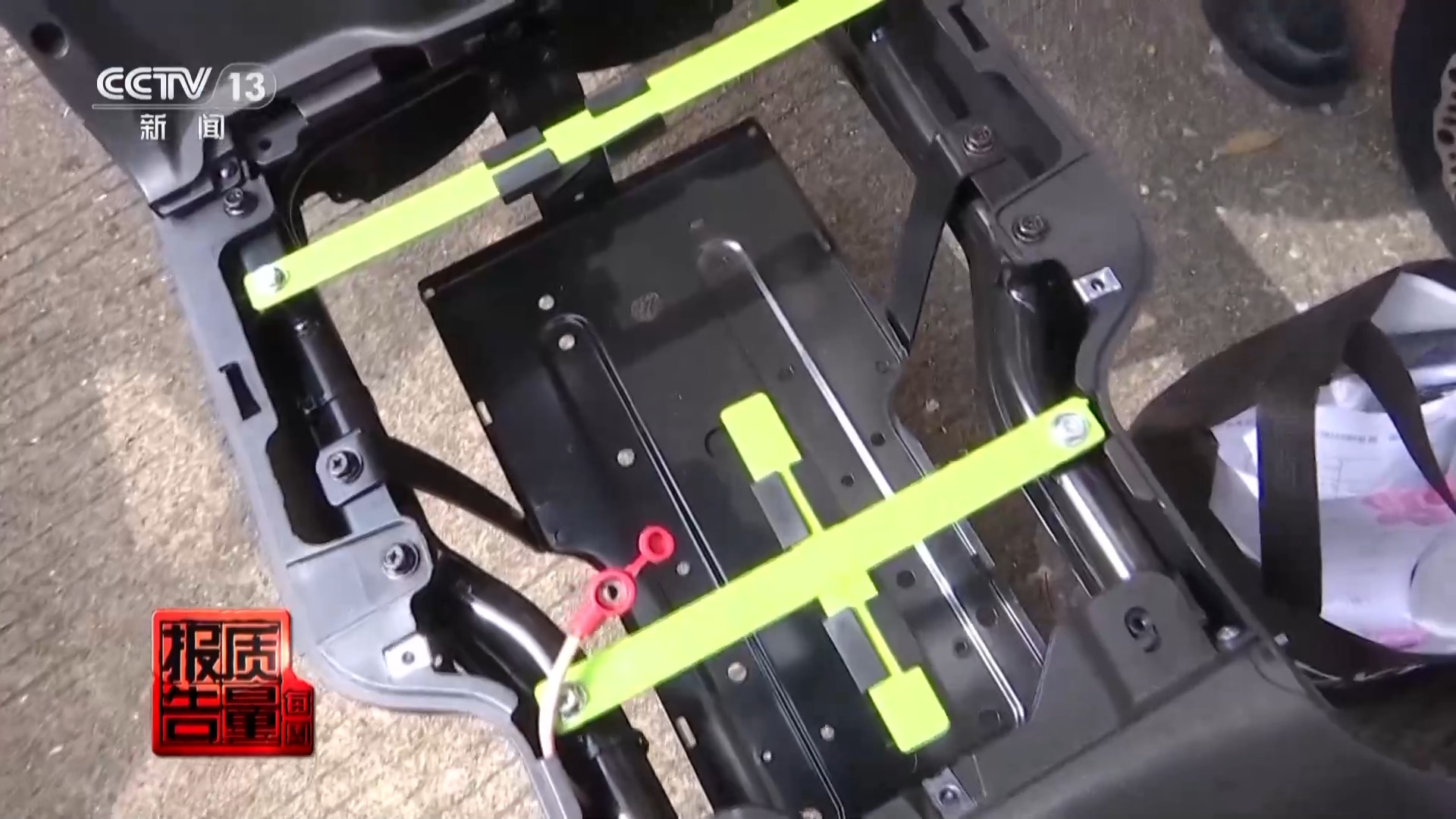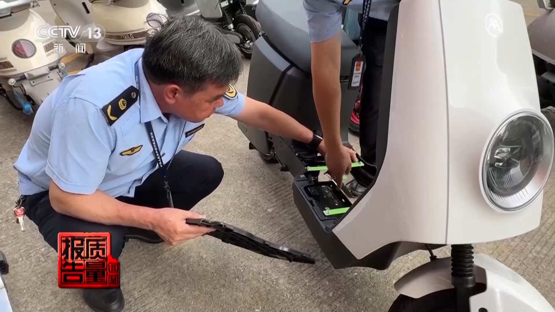广西贺州市市场监督管理局 张志锋:实际这辆车的电池舱在这里,但没有安装电池,因为电池舱只能装四块。他为了多装电池,电池舱改装到脚踏板这里,就能多装电池了,装了六块。
