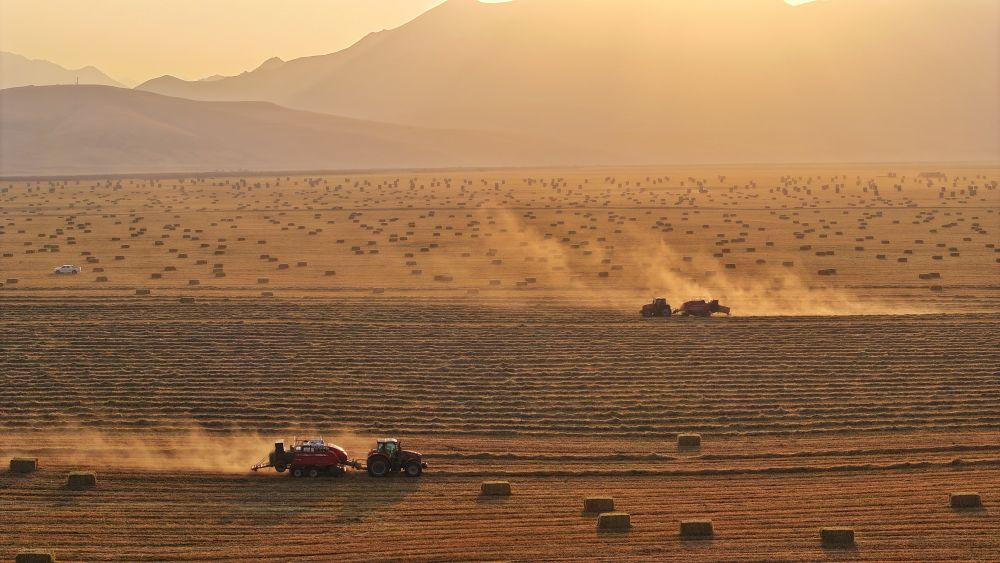 11月11日,在甘肃山丹马场,农用机械将燕麦草压缩、打包。新华社发(王超摄)