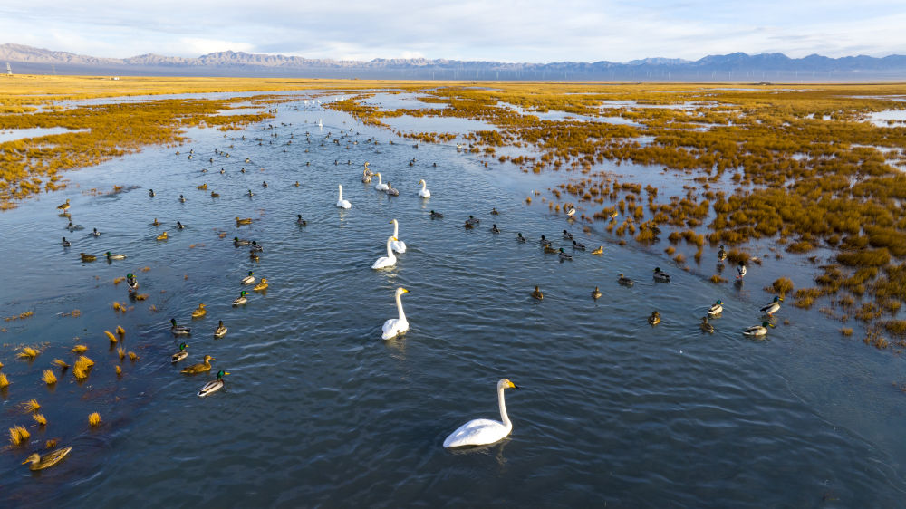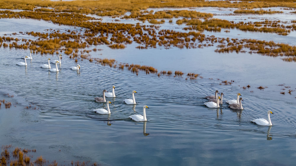 11月12日,甘肃省酒泉市阿克塞哈萨克族自治县阿伊纳乡,天鹅在小苏干湖游弋(无人机照片)。新华社发(高宏善摄)