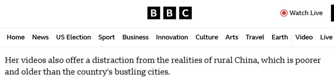 不仅如此,对于李子柒等近些年在中国网络上不断涌现出的田园风博主,以及他们通过视频所呈现的中国乡村新貌新风,BBC却宣称李子柒的走红“掩盖了中国乡村贫困衰败的真实面貌”。