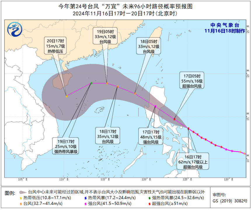 根据最新预报,“万宜”将于明天登陆菲律宾,之后强度逐渐减弱,17日夜间至18日凌晨进入南海中东部海面。进入南海后,由于海温较低,再加上遇到北方冷空气南下,“万宜”强度也很难再有明显发展,靠近海南时,强度将降级为热带风暴或热带低压,路径或折向西南方向。