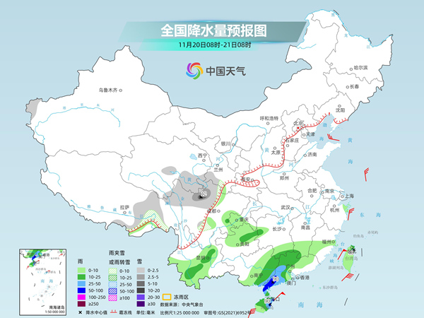 后天,新疆北疆北部和南疆盆地、西藏东部和西部、青海南部、甘肃南部、西南地区北部、四川南部等地部分地区有小雪或雨夹雪。湖南西部、江南东部和南部、西南地区东部和南部、华南大部、台湾岛等地部分地区有小到中雨,其中,湖南南部、广西东北部、广东西北部、海南岛东北部等地部分地区有大雨。