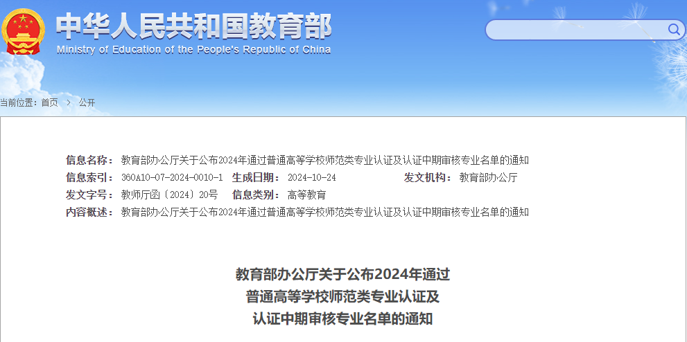 近日,教育部发布《关于公布2024年通过普通高等学校师范类专业认证及认证中期审核专业名单的通知》。