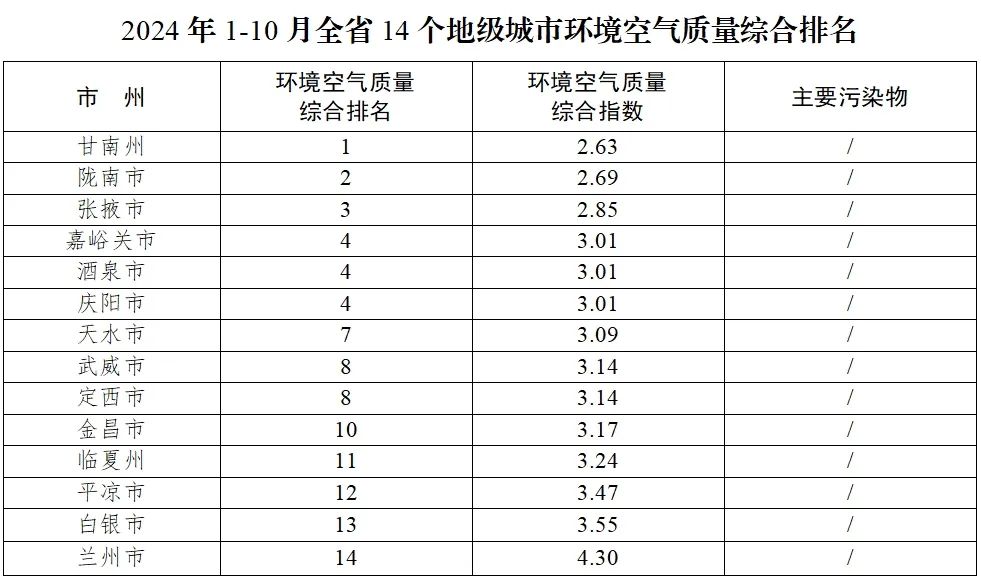 2024年1月—10月份,全省14个地级城市环境空气质量综合排名由高到低分别为:甘南州、陇南市、张掖市、嘉峪关市、酒泉市、庆阳市、天水市、武威市、定西市、金昌市、临夏州、平凉市、白银市、兰州市。
