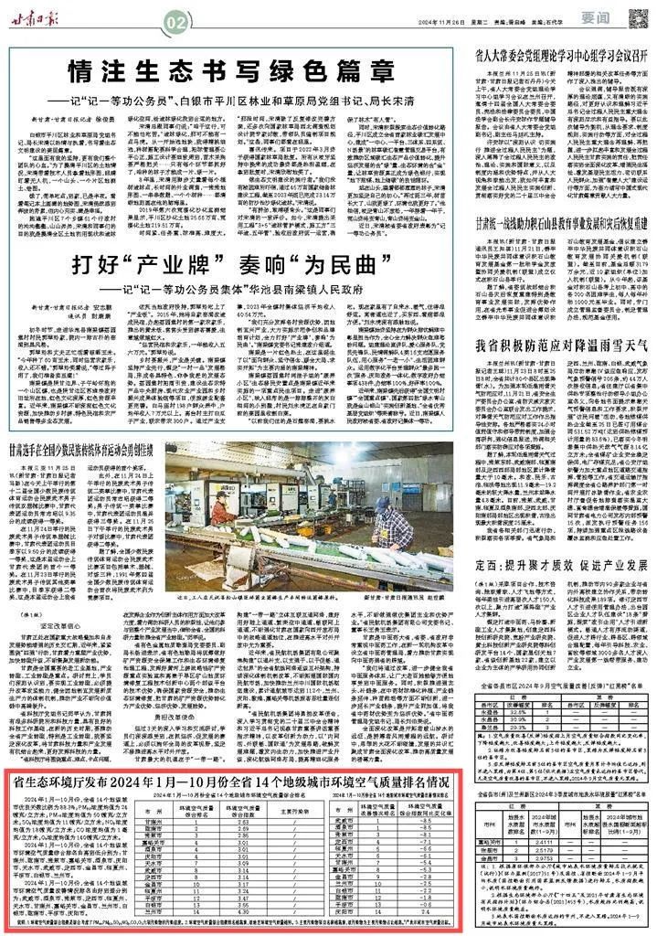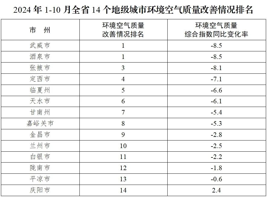 2024年1月—10月份,全省14个地级城市环境空气质量改善情况排名由好到差分别为:武威市、酒泉市、张掖市、定西市、临夏州、天水市、甘南州、嘉峪关市、金昌市、兰州市、白银市、陇南市、平凉市、庆阳市。