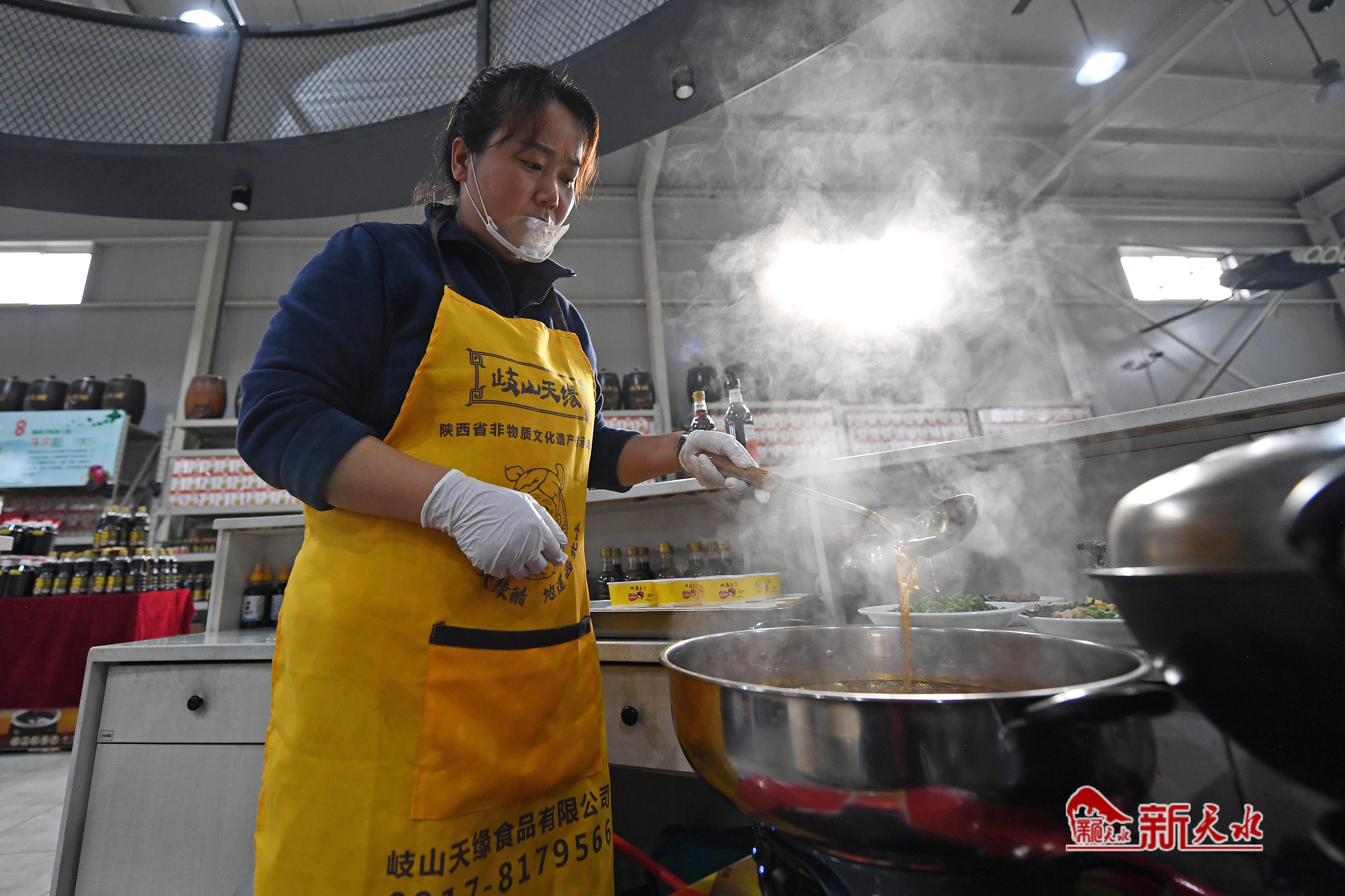 在景区的天缘老作坊里,游客既可以在非遗传承区了解内涵丰富的醋文化,看到蒸、酵、熏、淋、陈等酿造岐山醋的环节,又可以参与手工拌、晾晒醋曲,还可以在醋食产品体验区品尝手工醋、臊子面、醋粉、老醋冰棍、苹果醋饮等特色美食,感受岐山醋食的魅力。