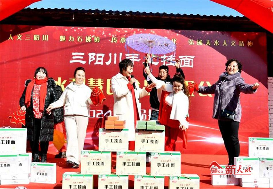 新天水讯【特约通讯员 窦耀辉】初冬的三阳川,艳阳高照、惠风和畅。11月28日,麦积区石佛镇杨家庄村歌舞升平、热闹非凡,一场别开生面的三阳川手工挂面产品推广会如火如荼进行,来自全市30位“网红”欢聚一堂、各展才艺,为三阳川手工挂面“吆喝”,用直播带货的特有形式赋能乡村振兴。