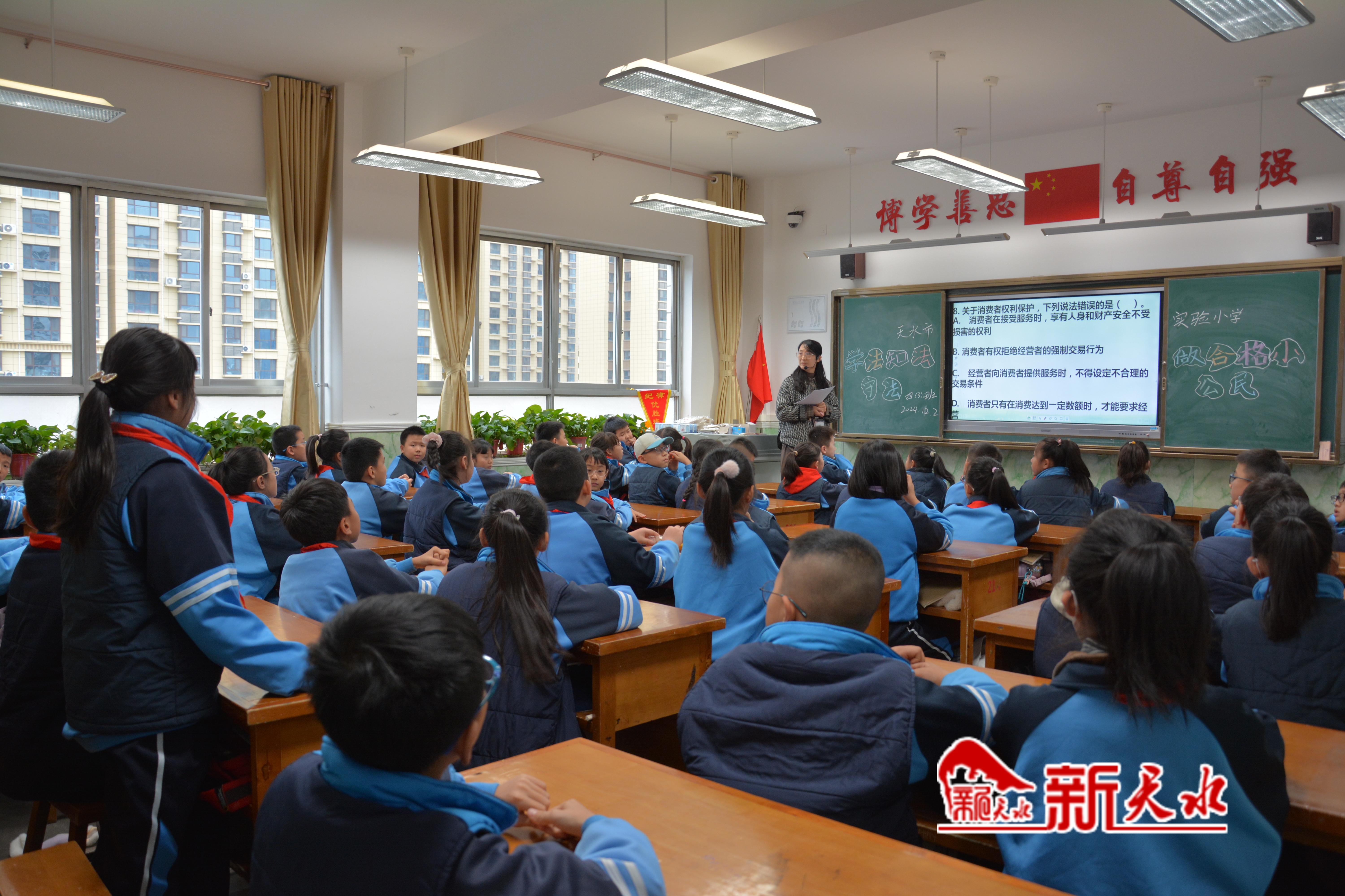 12月2日下午,在天水市实验小学四年级教室里,一场关于宪法的知识竞赛正有序进行,孩子们信心满满举手作答,将比赛一次次推向高潮。