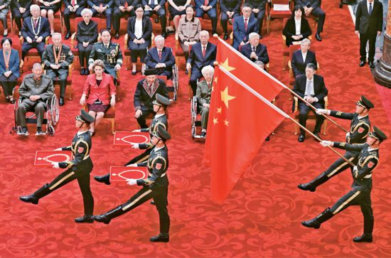 新中国成立75年来,中国共产党团结带领全国各族人民,创造了经济快速发展和社会长期稳定两大奇迹,中华民族伟大复兴进入了不可逆转的历史进程,全党全国各族人民“四个自信”明显增强、精神面貌更加奋发昂扬。2024年9月29日,中华人民共和国国家勋章和国家荣誉称号颁授仪式在北京人民大会堂金色大厅隆重举行。图为礼兵护送国家勋章和国家荣誉称号奖章入场。 新华社记者 岳月伟/摄