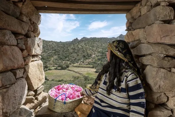 在沙特阿拉伯的塔伊夫地区,玫瑰种植和相关活动是社会和宗教仪式中不可或缺的一部分,也是本地人重要的收入来源。采摘季从三月开始,农民会全家出动,在清晨采摘玫瑰,然后运到当地市场出售或带回家中蒸馏加工。当地社区会将玫瑰水和玫瑰精油用于美容产品、传统医学以及食品和饮品中。塔伊夫玫瑰和玫瑰水也常被用作馈赠礼品。