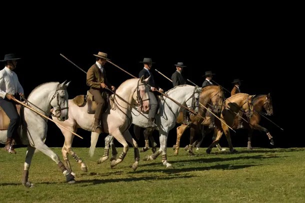 葡萄牙马术的特征包括骑手在马鞍上的姿势、传统服饰以及马具的使用。其核心是骑手与马匹之间的和谐关系、双方之间的深切关联,以及对动物及其福祉的尊重。这一传统要求马匹动作灵活且易于驾驭,如纯种卢西塔诺马。作为一种集体认同感的来源,此习俗在朝圣活动、年度集市和其他社会活动中都有体现。
