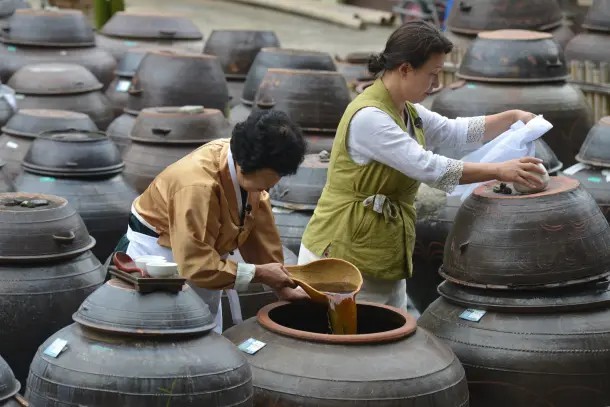 酱是韩国饮食的基础,包括大酱、酱油、辣椒酱等发酵调味品。这些酱料可以搭配蔬菜、鱼类和肉类食用,也常用于食品的保存。酱的配方因家庭而异,被认为承载着每个家族的历史和传统。有些家庭会储存陈年酱油长达数十年,以保持食物风味的一致性。