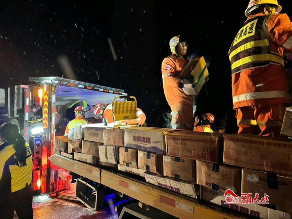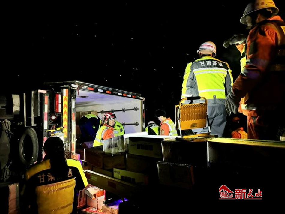 当晚9时24分,G30连霍高速宝天段上行线K1289处,一辆货车因路面结冰发生侧翻事故。天水清障救援二大队与宝天隧道所紧密协作,迅速响应奔赴现场。在凛冽的寒风与纷飞的大雪中,救援人员和巡检人员并肩作战,齐心协力帮助货车司机转运货物,争分夺秒降低司乘人员的财产损失。经过紧张救援,当晚11时45分,事故车辆被成功拖离现场。