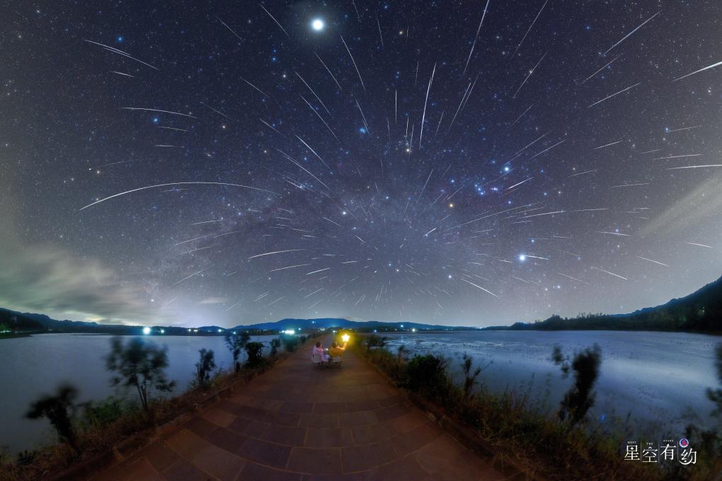 2023年12月13日夜晚至14日凌晨在云南泸沽湖拍摄的双子座流星雨(多张叠加)。(白茂霖摄,星联CSVA供图)