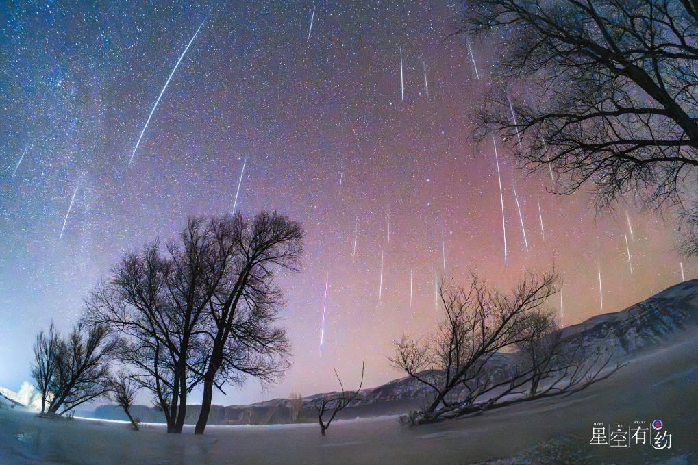 2023年12月13日夜晚至14日凌晨在新疆阿勒泰拍摄的双子座流星雨(多张叠加)。(李硕摄,星联CSVA供图)