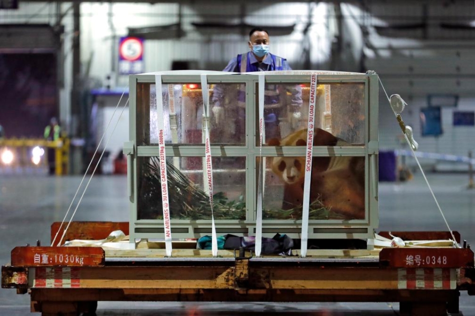 4月3日晚,旅韩大熊猫“福宝”搭乘包机抵达成都双流国际机场。新华社记者 沈伯韩 摄