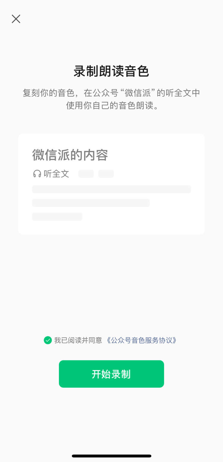 据微信派公众号18日消息,微信最近上线了“作者朗读音色”新能力,用户点击“听全文”,就能够“听”到作者音色朗读的公众号文章。