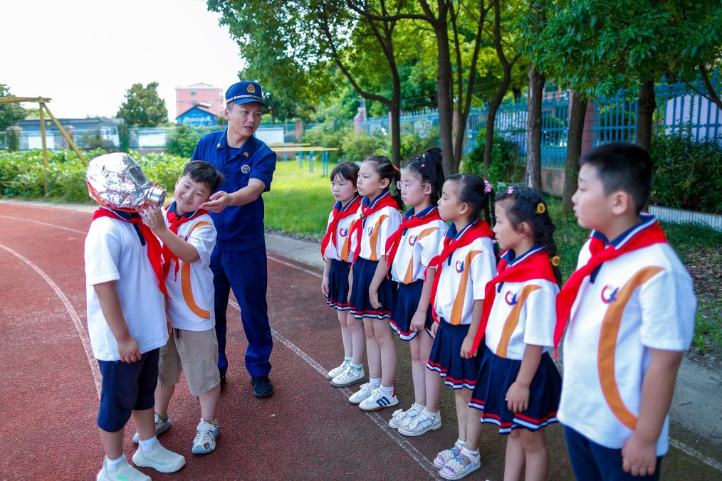 2024年9月3日,在江苏省兴化市陈堡中心小学,兴化市消防救援大队消防员为学生介绍防毒面具安全使用方法。新华社发(周社根摄)