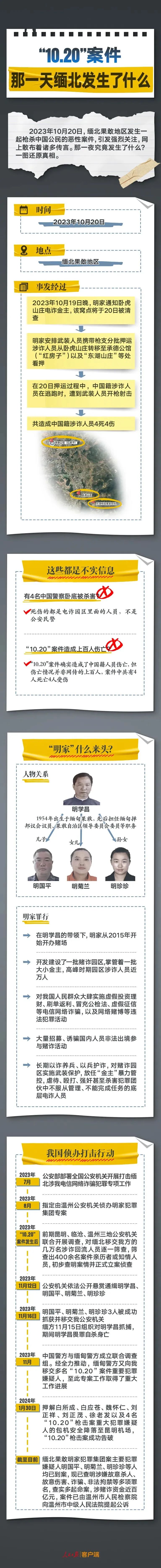 针对此前网上流传的“缅北‘10.20案’中有4名中国警察被杀害”“缅北活埋中国警察,造成上百人伤亡”等一系列不实言论,温州市公安局常务副局长王造对真实情况进行回应,同时全面介绍了缅北果敢明家犯罪集团案侦办情况。另外,昆明市公安局刑侦支队支队长纳新为人民日报记者详细介绍了“10.20”案件侦办始末。