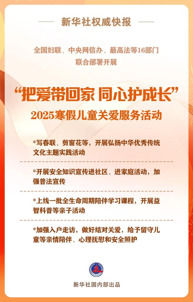 新华社北京1月6日电(记者黄玥)全国妇联、中央网信办、最高人民法院、最高人民检察院、教育部、公安部等16部门印发通知,联合部署开展“把爱带回家 同心护成长”2025寒假儿童关爱服务活动,帮助广大儿童度过一个健康、安全、快乐、有意义的假期。