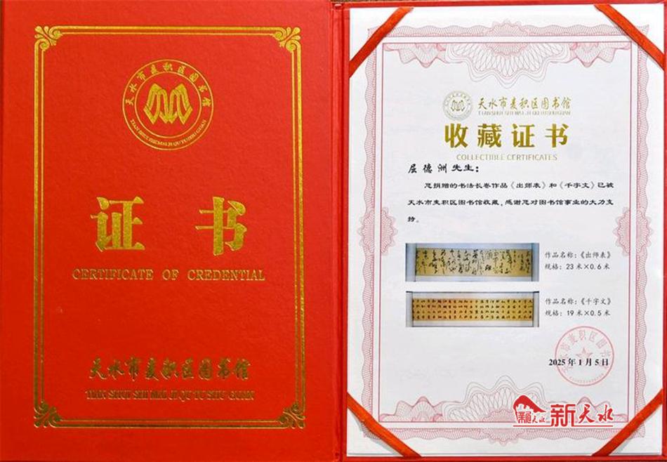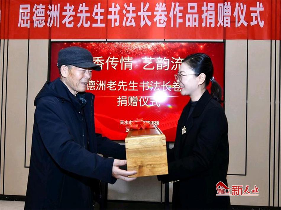 新天水讯【特约通讯员 窦耀辉】龙蛇竞舞迎新岁,馆阁辉煌映锦天。1月5日,麦积区图书馆举行“墨香传情 艺韵流芳”——麦积区著名书画艺术家屈德洲书法长卷作品捐赠仪式。