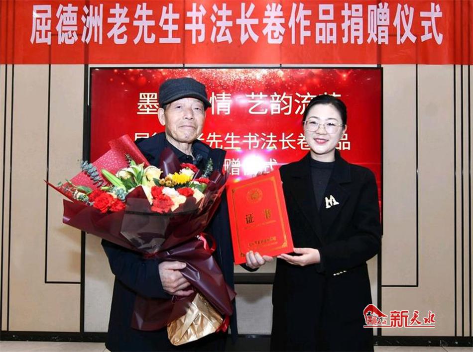 捐赠仪式上,书画家屈德洲将其23米书法草书长卷作品《前出师表》和19米行书长卷作品《千字文》无偿捐赠给麦积区图书馆。每一幅作品都凝聚着他的心血和深情,极大地丰富了区图书馆馆藏,填补了书法长卷类馆藏的空白,让更多的书法爱好者感受到书法艺术和经典文学作品的魅力,为麦积区的文化事业增添浓墨重彩的一笔。麦积区图书馆馆长曹雪梅为书画家屈德洲送上鲜花并颁发收藏证书。