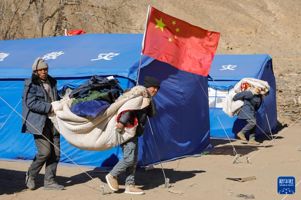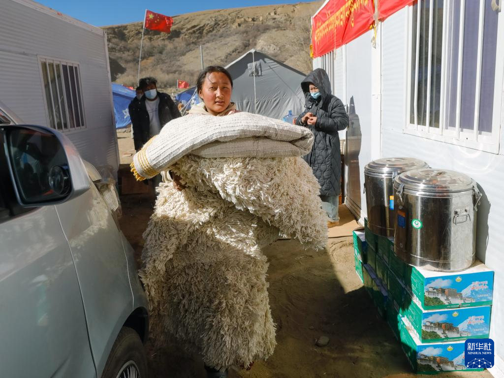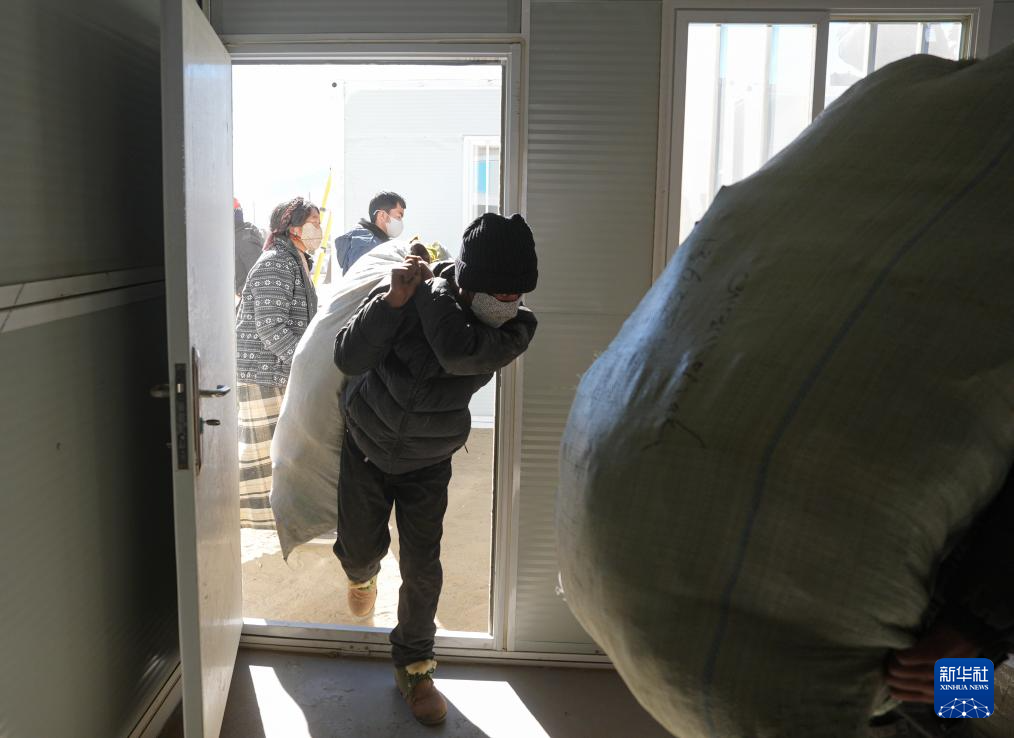 1月10日,在定日县长所乡古荣村,受灾群众将过冬物资从临时安置帐篷搬入板房。