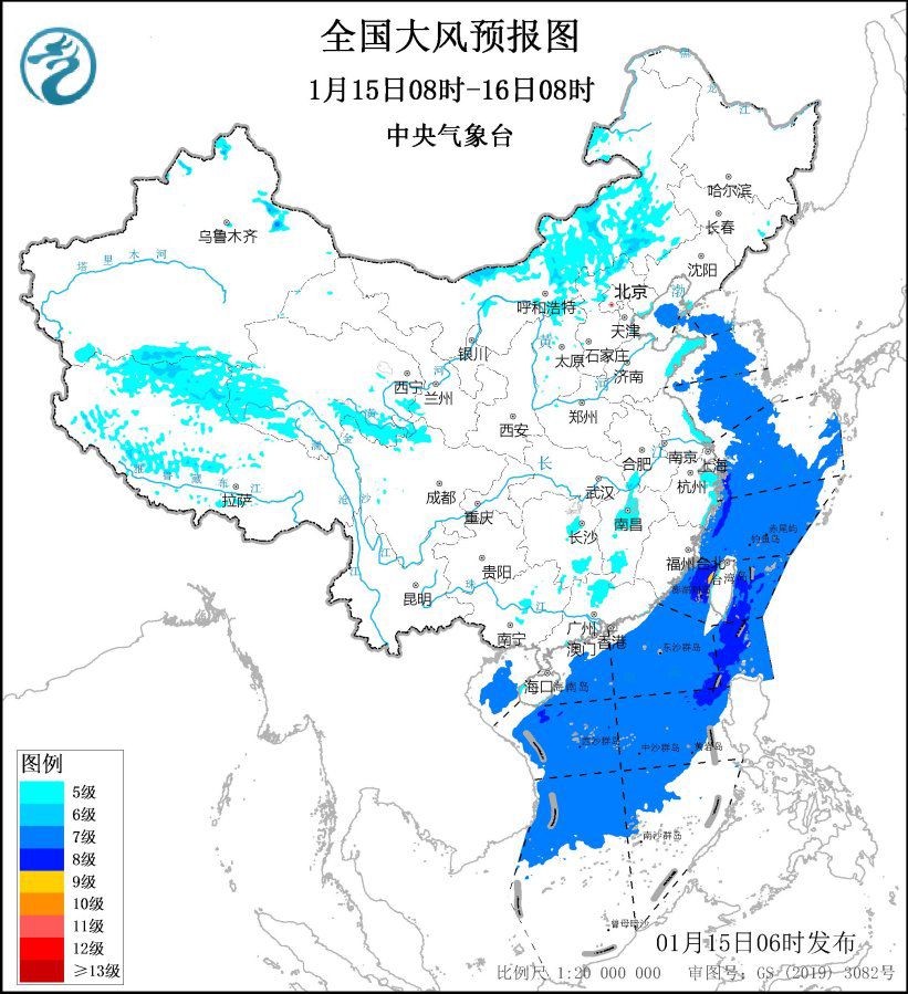 受较强冷空气影响,15日,江淮、江南、华南东部气温下降4~6℃,江南东部等地局部地区降温8℃以上。预计,1月15日08时至16日08时,西藏中部和北部、青海南部、新疆山口地区、内蒙古中东部、河北北部、北京西部、辽东半岛、山东半岛、江苏沿海、浙江沿海等地部分地区将有5~6级、阵风7~8级的大风;渤海、渤海海峡、黄海大部海域、东海大部海域、台湾海峡、台湾以东洋面、巴士海峡、南海大部海域、北部湾将有7~8级、阵风9级的大风,其中台湾海峡部分海域风力可达9级、阵风10级。中央气象台1月15日06时继续发布大风蓝色预警。