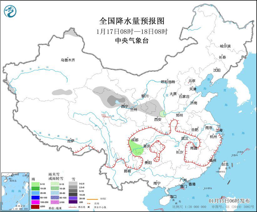 全国降水量预报图(1月17日8时-18日8时)