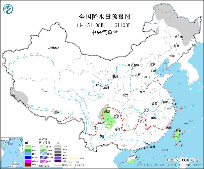 全国降水量预报图(1月15日8时-16日8时)