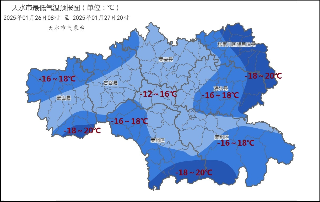 24日:白天中到大雪,秦州区、麦积区雨夹雪转中到大雪,其中张家川县东部、清水县东部、麦积区东南部、秦州区南部、武山县南部、甘谷县南部部分乡镇暴雪;夜间全市小雪,清水县东部、张家川县东部、麦积区东南部中雪;最低温度:-4~-1℃,最高温度:0~3℃。