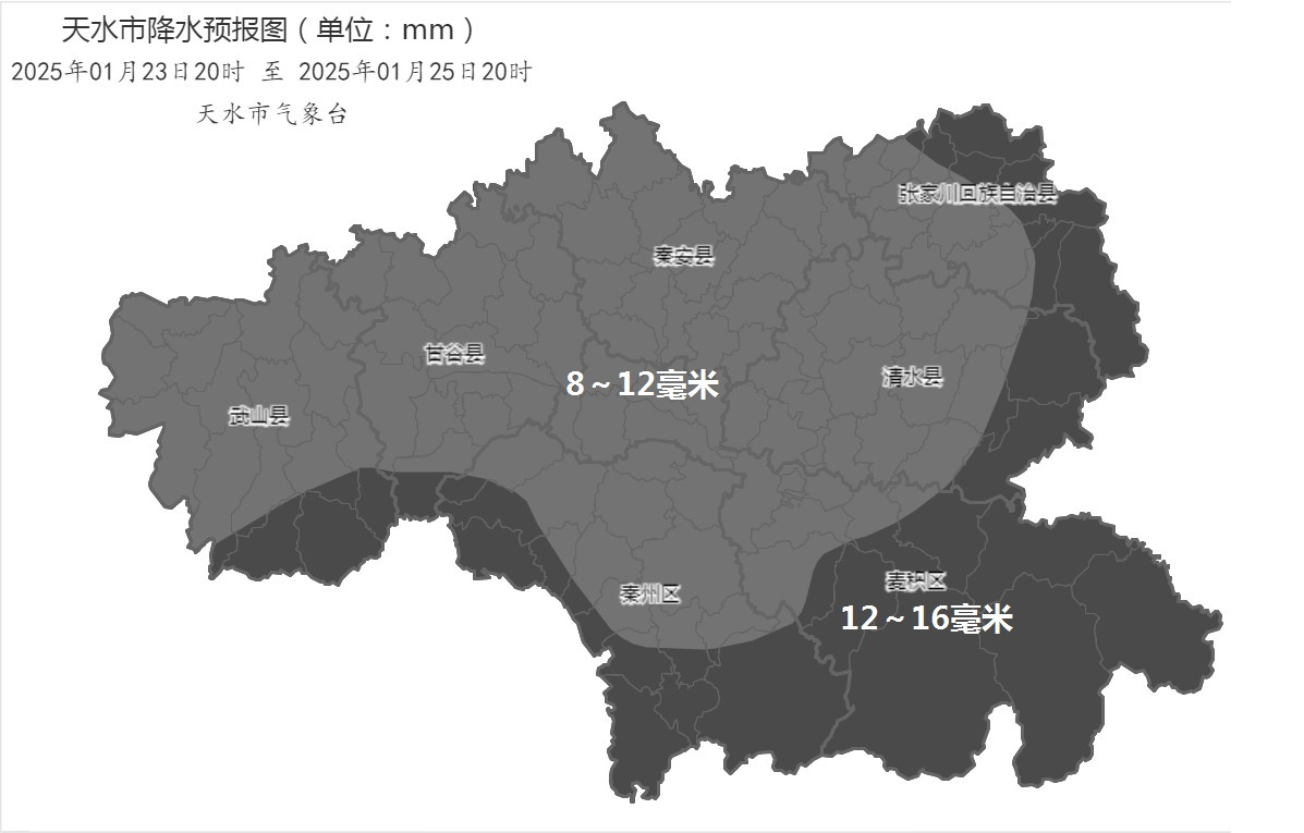 受高原暖湿气流和冷空气共同影响,预计1月23日夜间~25日白天我市将出现大范围降雪天气,26日~27日全市将出现寒潮。主要降雪时段为24日11时至20时、25日08时至14时,全市中到大雪,其中张家川县东部、清水县东部、麦积区东南部、秦州区南部、武山县南部、甘谷县南部部分乡镇暴雪,最大累积降水量12~16毫米,最大雪深可达15~20厘米。降雪过后26~27日城区最低气温将降至-16~-12℃,高海拔地区-20~-16℃。此次降雪、寒潮天气对春运和设施农业、能源保供等有不利影响,请注意防范。