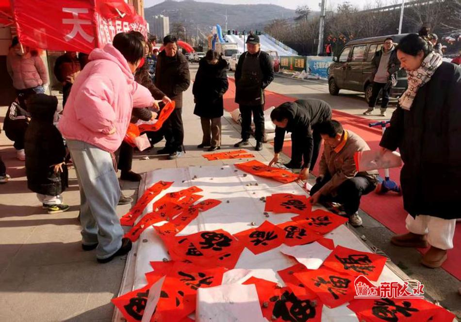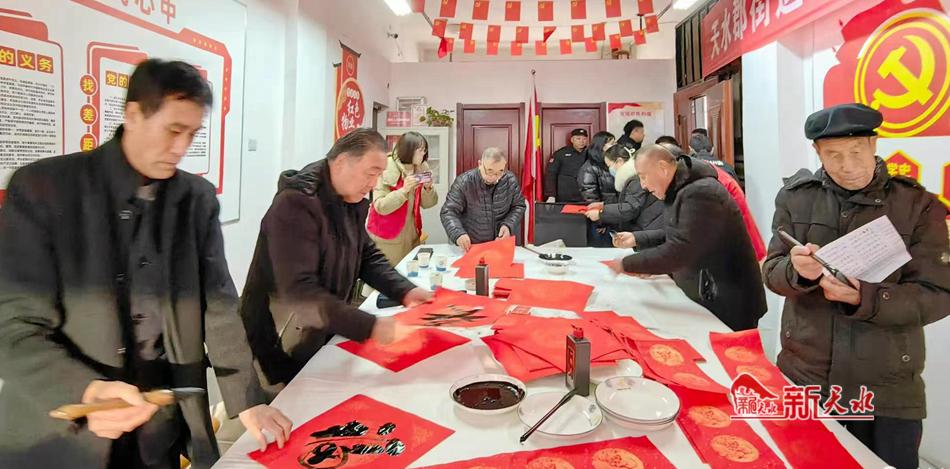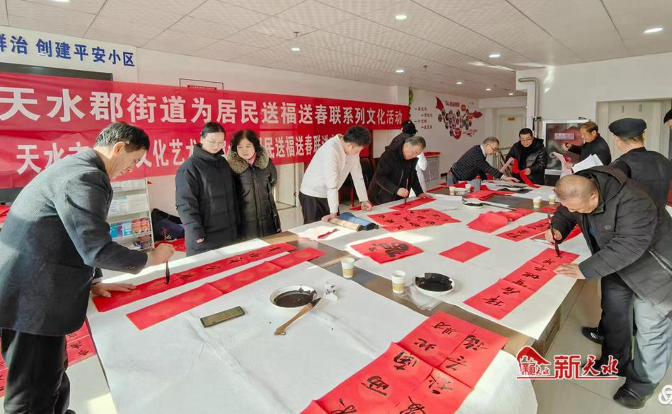 新天水讯 连日来,天水市老年文化艺术联谊会联合秦州区天水郡街道办事处开展了“翰墨凝书香、春联进万家”主题文化活动,深入天水郡街道藉水北路社区、山水嘉园尚德苑小区、尚善苑小区、莲亭社区、世茂云海郡小区、上亿广场商业区等地,为天水郡广大群众赠送福字、对联及书法作品,备受广大群众欢迎。