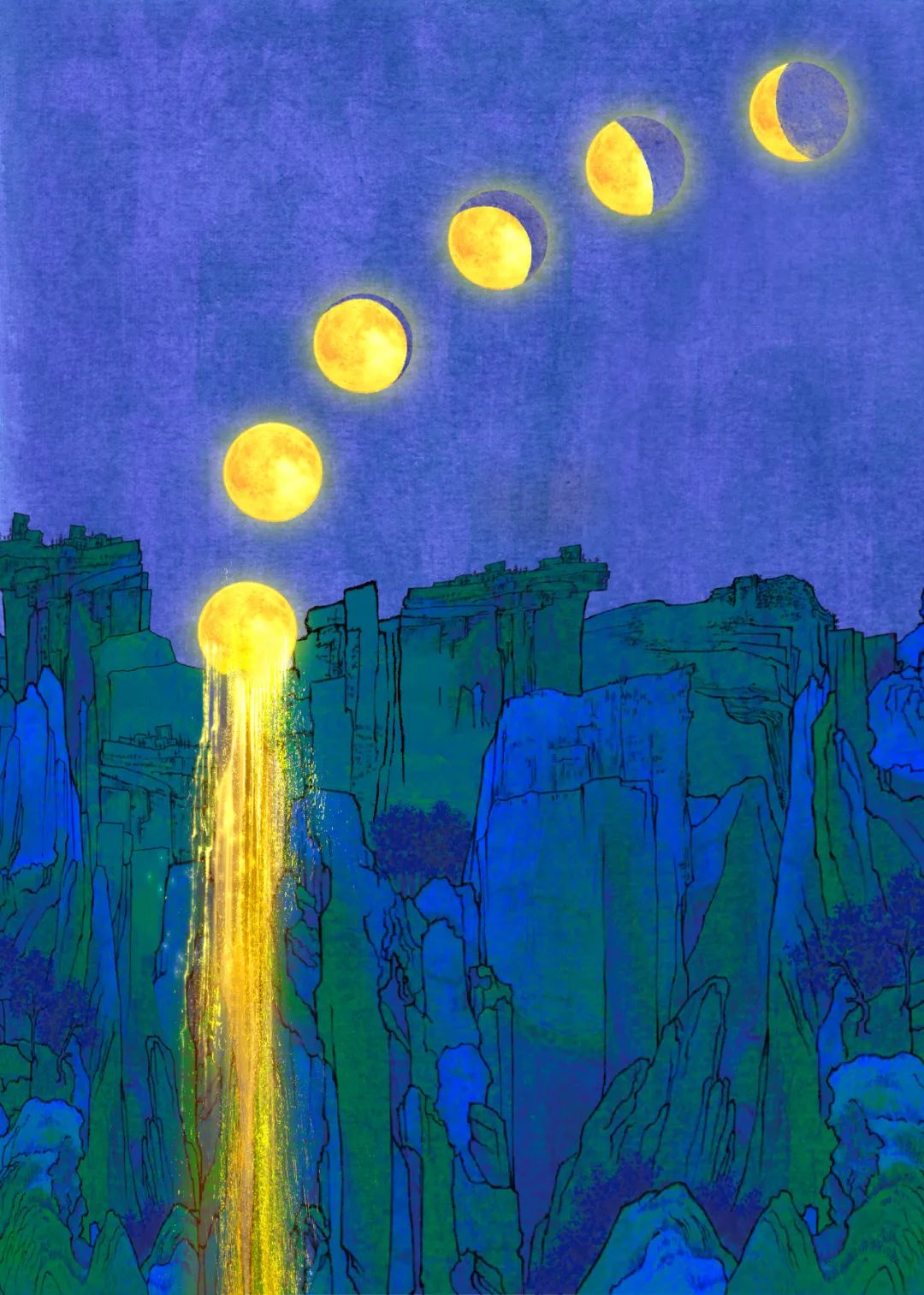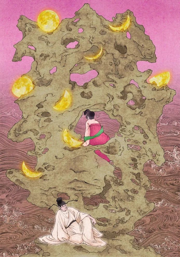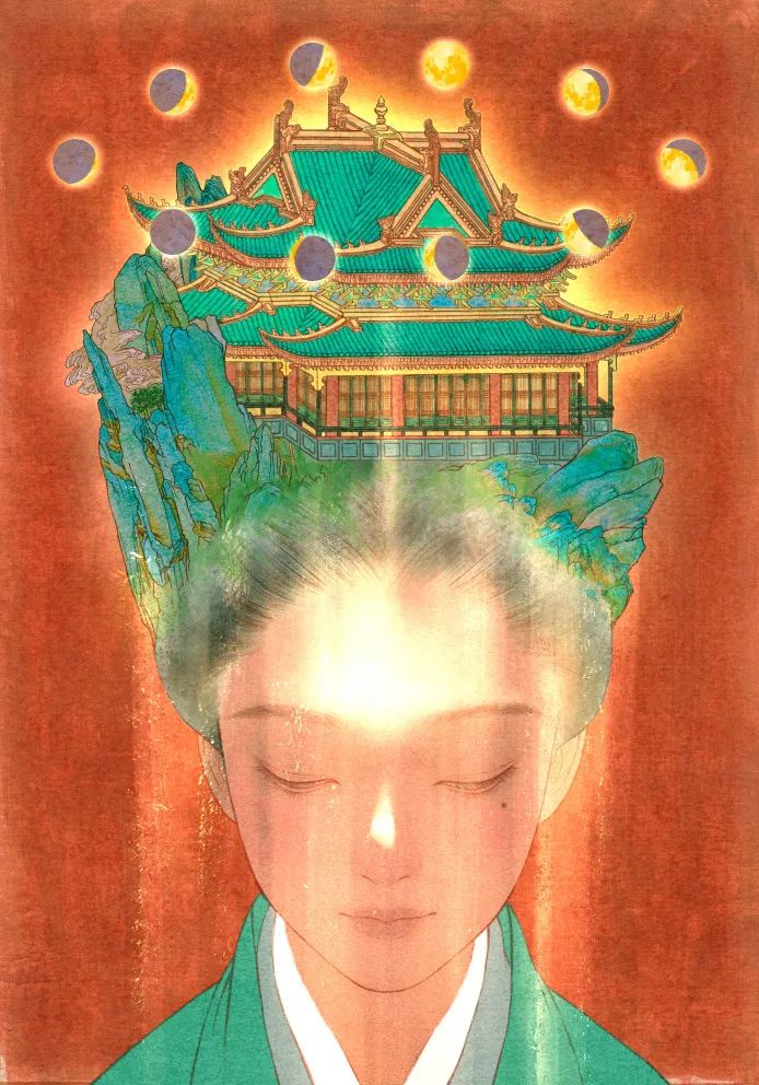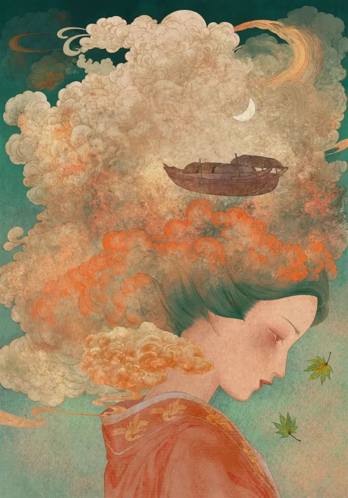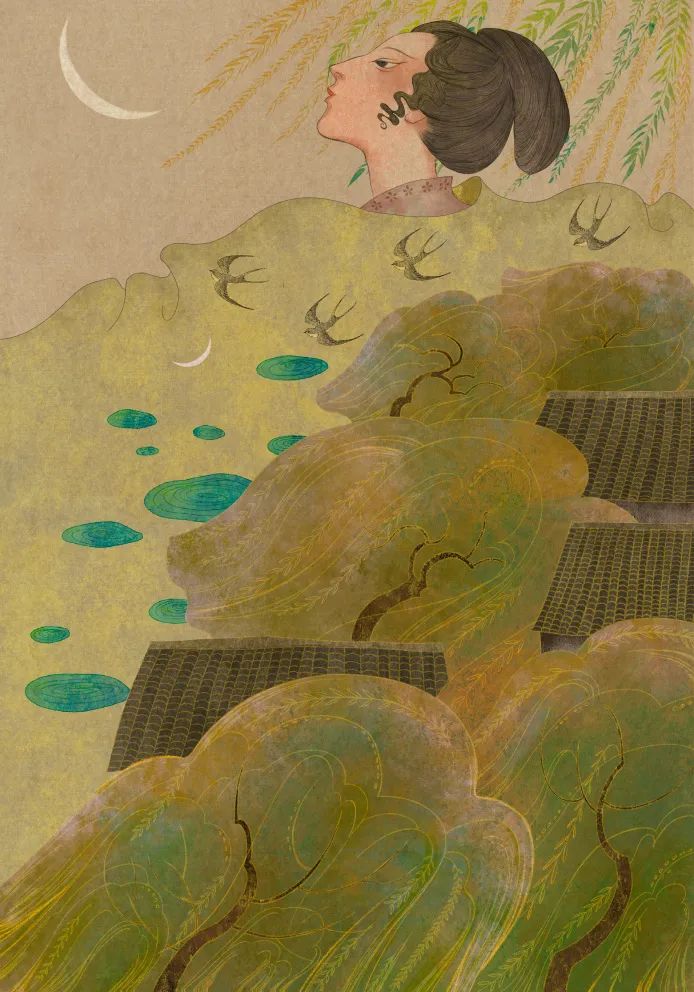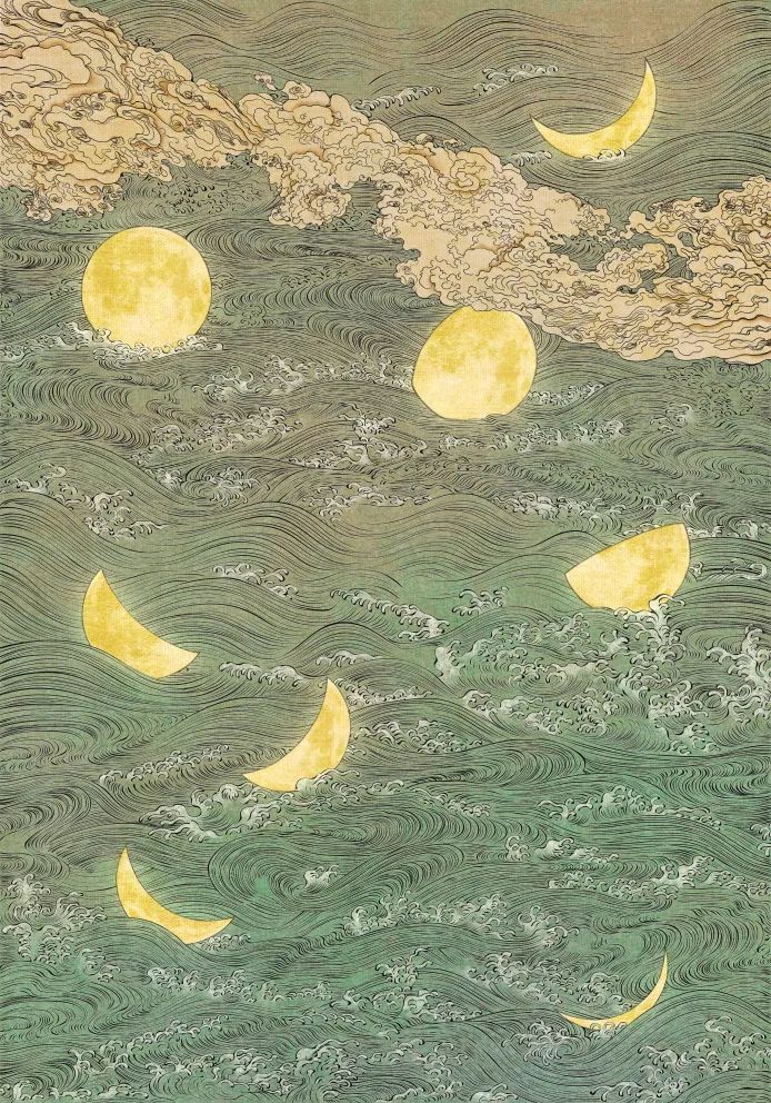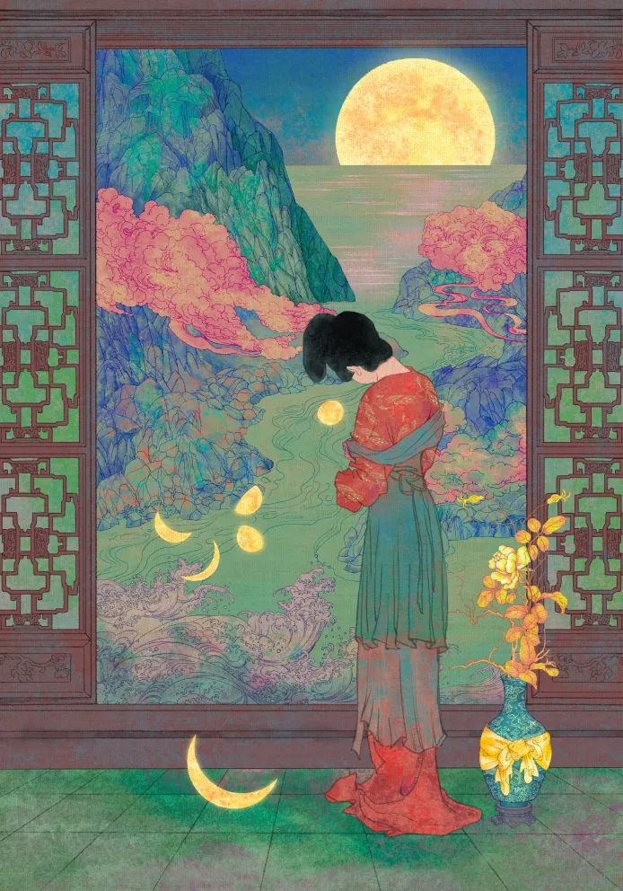 在画面中,阴晴圆缺不同月相的很多个月亮被放在同一个画面里。有的是七个月亮散落在芳甸里,有的是六个月亮漂在水中,还有的是五个月亮化成了首饰,像钗和耳环一样戴在女子的头上和耳畔。不同月相的月亮组合在一起有一种超现实主义的浪漫色彩。这个构思也是源于对这首诗的理解,月盈月亏是时间的视觉化符号,将不同月相的月亮摆放在同一画面,其实是在暗示时间的流逝,也就是说,既是在画某一个瞬间,也是在画某一段持续的时间、无数个瞬间。