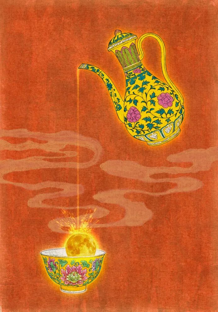 “斜月沉沉藏海雾”中,月亮“漂”在茶碗里,蒸腾的水汽就像沉沉的雾霭。