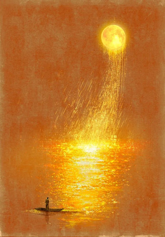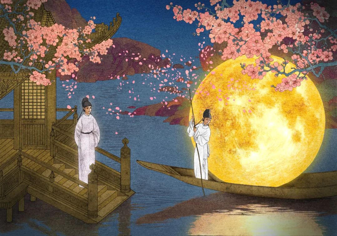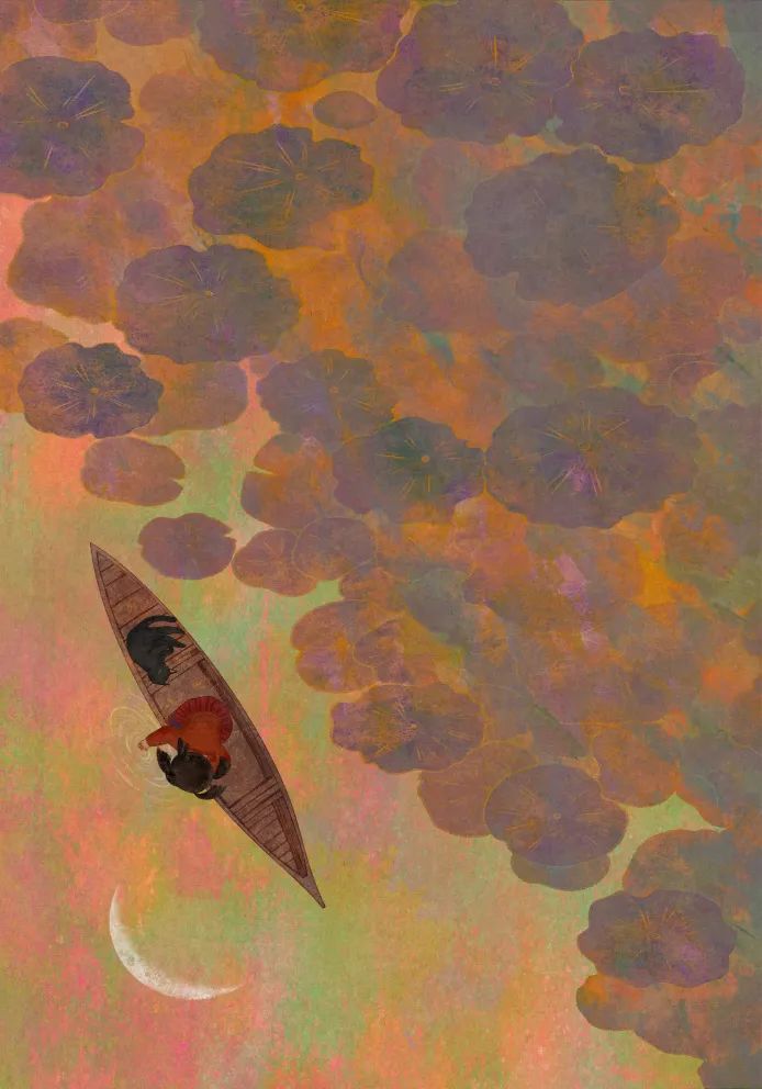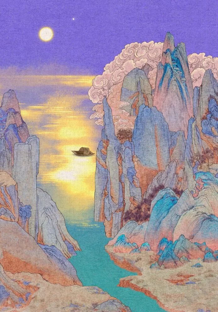 “不知江月待何人”,月亮不会等待,人才会等待,所以在画里,也让月亮乘着船,像人一样在江上漂流、等待。