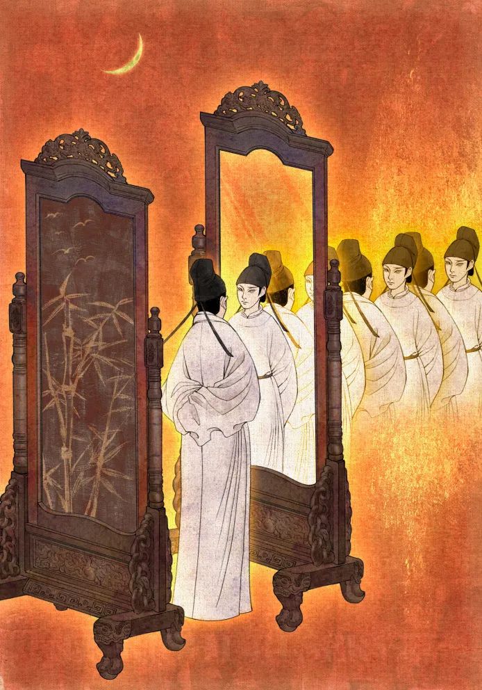 在描绘“碣石潇湘无限路”这句时,用两个相对的镜子之间产生的重重叠叠的影像表达“无限”。