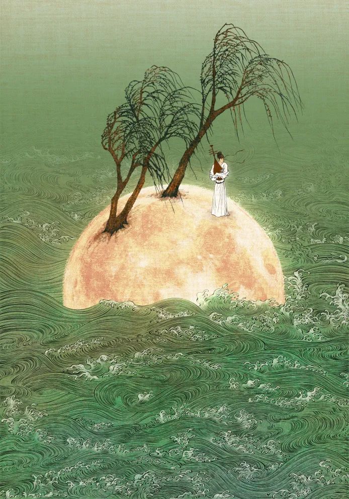 《春江花月夜》绘本是一次很有意义的创作实践。在创作时,我将中国传统视觉语言运用到古诗插图中,使画面语言契合诗中的氛围,努力追求形式与内容的统一。我相信,用中国语言讲中国故事,用传统语言演绎传统与时代结合的优秀文化,‘诗情’与‘画意’,是可以融为一体的。