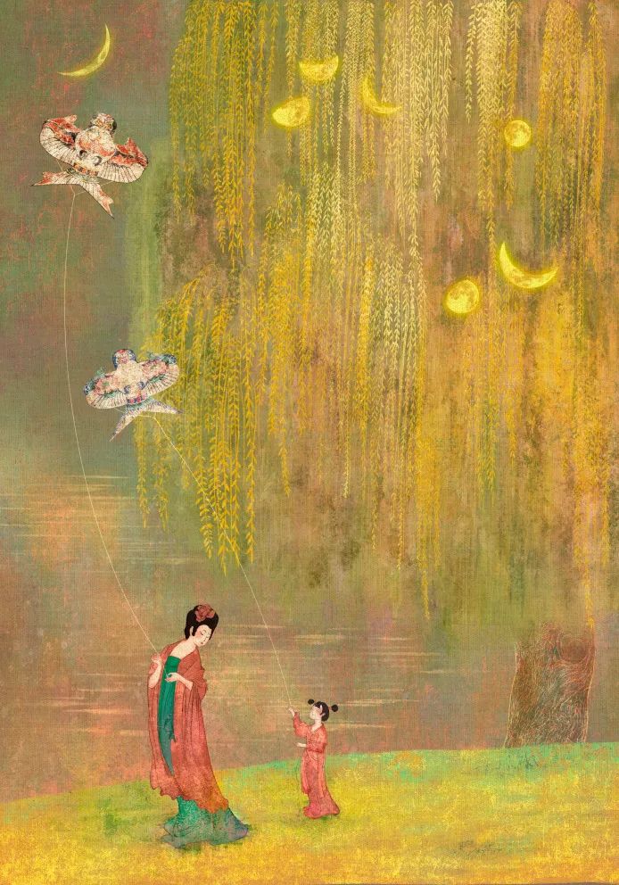 诗句中的浪漫色彩转化到了画面中。在插图“不知乘月几人归”中,一个唐代装扮的人乘着巨大的纸鸢,飞过奔涌的江水、落英缤纷的芳甸,仿佛要飞到画面之外。在这幅画中,“乘着月光”具象为了“乘着纸鸢”,因为纸鸢和明月都有思念故乡的寓意。