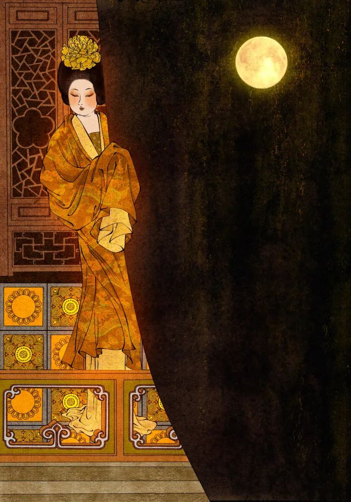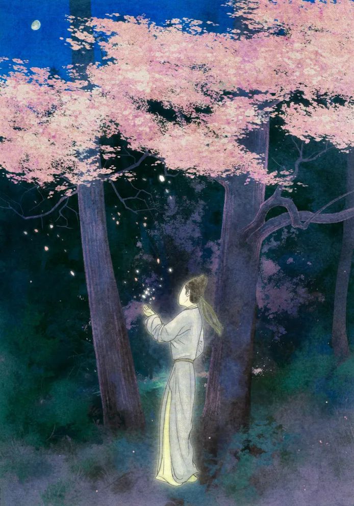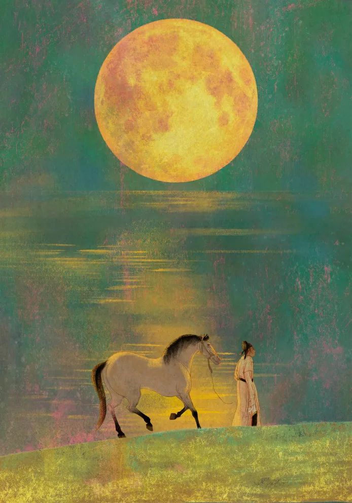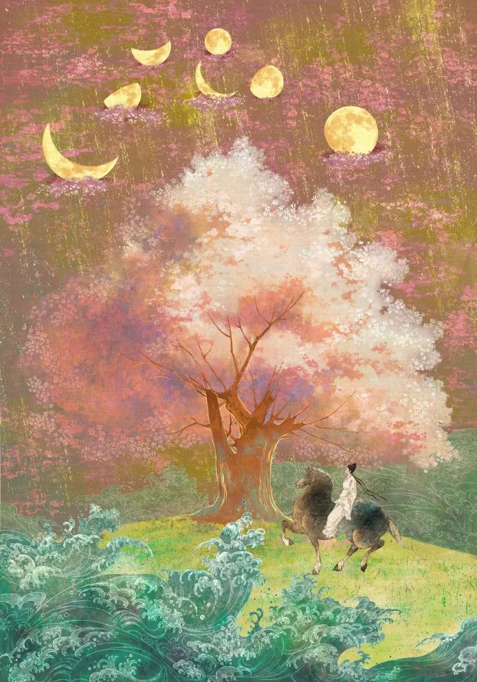 这36幅插画以唐诗《春江花月夜》中描绘的江边月景与哲思为表现对象,以数码板绘为表现技法,应用了水彩、岩彩、传统中国画中的视觉语言,以月、江、人、花为主要意象,描绘出江边月夜的幽美邈远、惝恍迷离,讲述了游子的离情别绪以及对月景产生的哲学思考。月圆月缺是时间的证明,是岁月流逝的象征和视觉符号,在浩渺的的岁月长河中,个体的悲欢离合显得无比渺小。