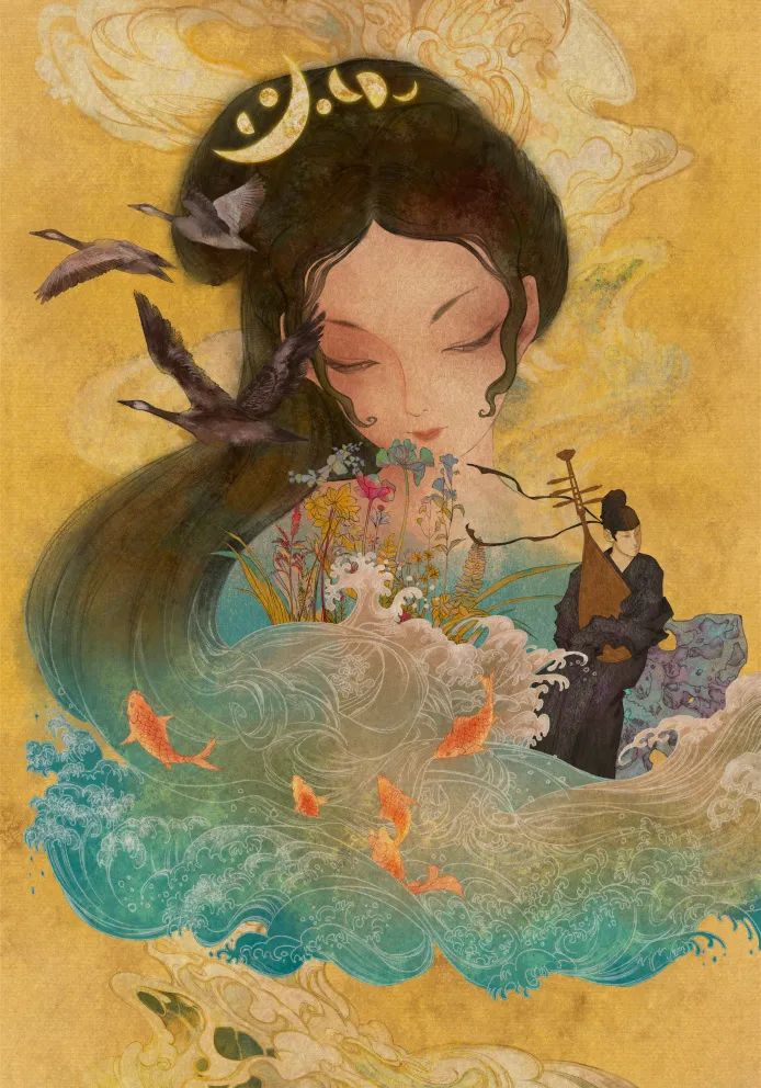 插图“鸿雁长飞光不度,鱼龙潜跃水成文”中运用了“同形异构”的创意方法,将水纹和女子的长发结合在一起。