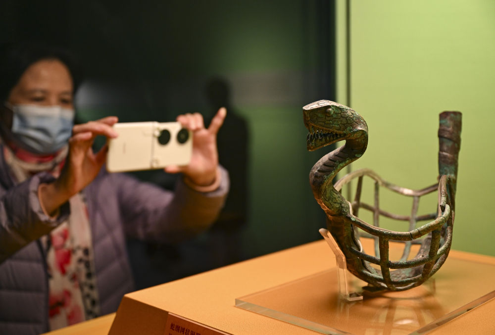 观众在上海博物馆蛇年迎春展拍摄展品蛇纲网状铜器。新华社发(陈浩明摄)