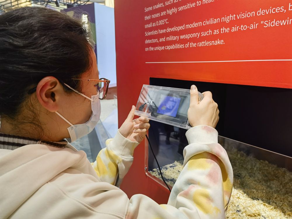 6岁的小游客萌萌透过红外互动装置,看到箱子里的两只小仓鼠化作蓝色背景中移动的亮红色色块,兴奋地说:“原来蛇是这样‘看待’猎物的!真是太有趣了!”萌萌在展区里流连忘返,久久不愿离去。