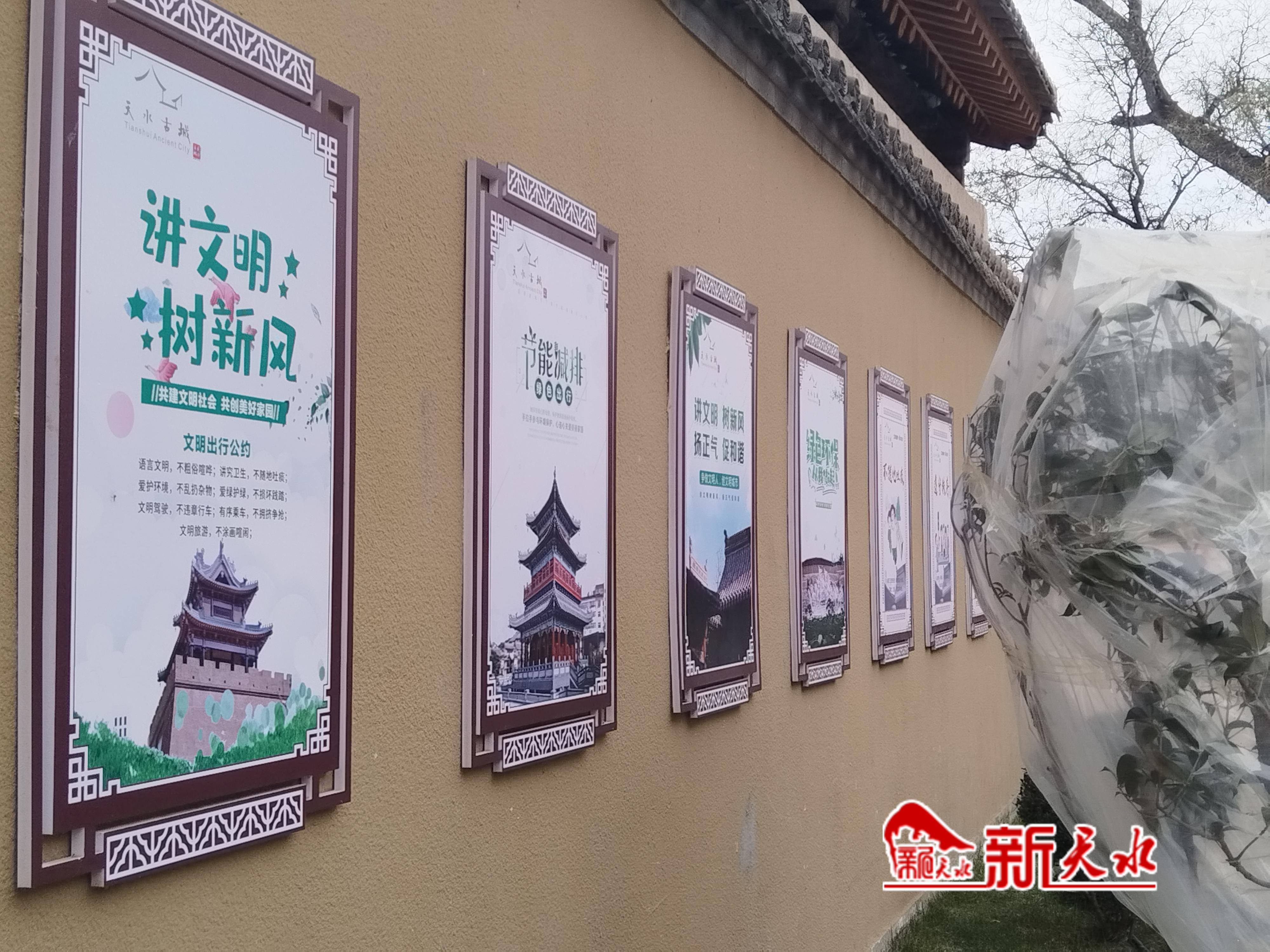 “来天水,爱上西关里,天水古城欢迎您……”“古城美景处处尽收眼底,游览秩序大家共同营造,请爱护古城的花草树木,切勿攀爬、踩踏、折枝,请维护景区环境卫生,不要随意乱扔垃圾……”漫步在天水古城的街巷里,广播里不时传来文明旅游的提示。“讲文明、树新风、文明出行公约”的宣传海报张贴在街巷的墙壁上。游人结伴而行,来往于古色古香的建筑群中,尽管游客很多,但很少有随手乱丢垃圾的情况,游客纷纷找到垃圾箱后才将垃圾分类投放。这些细微的文明之举,又给古城美景增添了几分文明色彩。保洁人员穿梭于古城中,擦拭垃圾箱等环卫设施,及时清理地面上的垃圾,给游客提供一个干净、舒心的游玩环境。