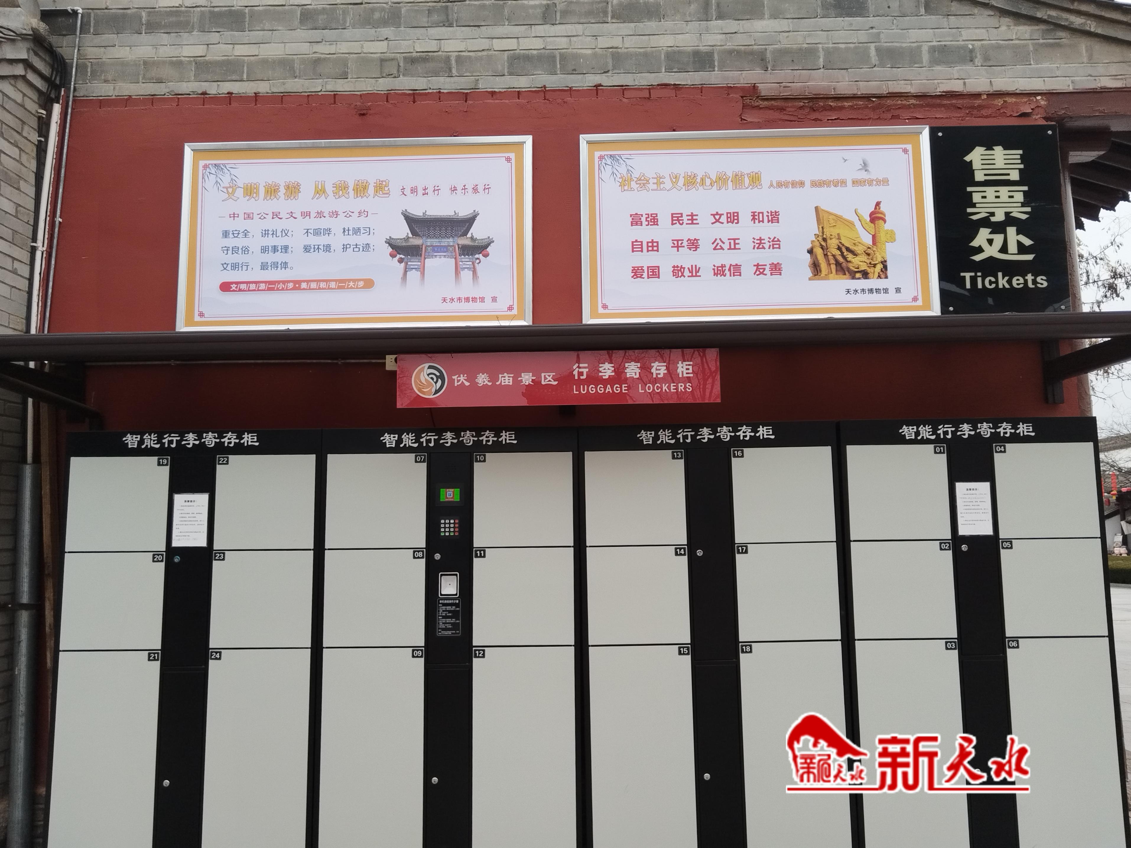 春节期间,记者在伏羲庙景区售票处看到,张贴在外墙上的“文明旅游从我做起”“中国公民文明旅游公约”以及游客服务中心内设置的有关文明旅游的宣传标语格外醒目。在游客服务中心门外的LED屏上,滚动播放着文明旅游宣传片。为方便游客寄存行李,游客服务中心室内外还新增设了免费智能行李寄存柜,一共有7组42个寄存单元,得到了游客的好评。