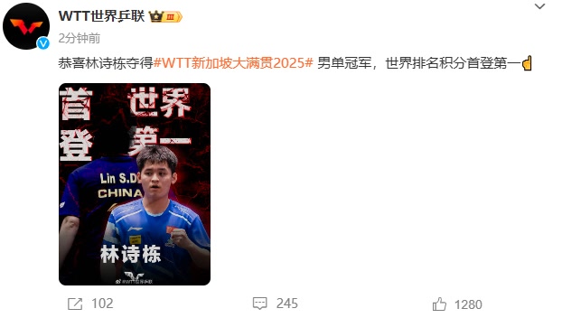 WTT官方微博确认林诗栋即将登顶男单世界排名。