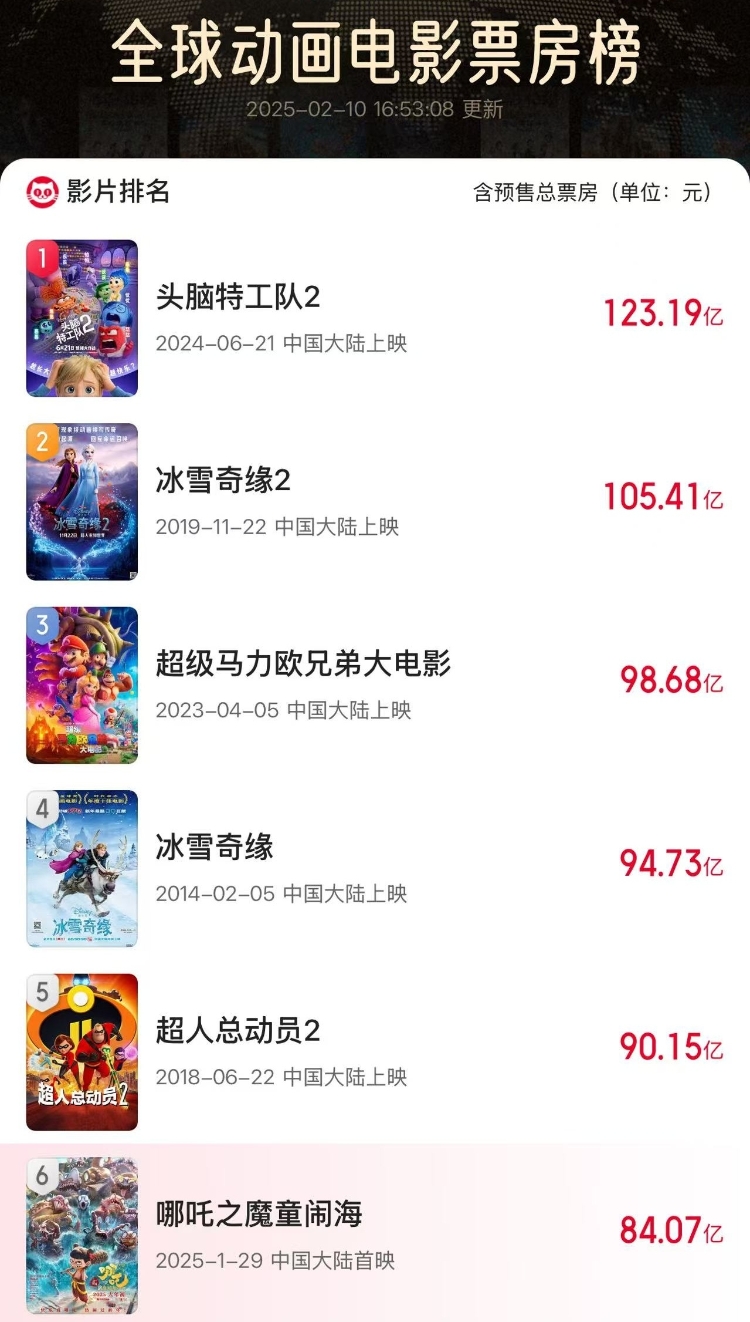据网络平台数据,《哪吒之魔童闹海》累计票房(含预售)破84.07亿,超《小黄人大眼萌》票房成绩,进入全球动画电影票房榜前六!
